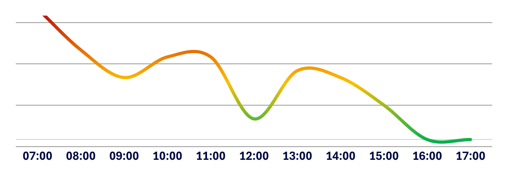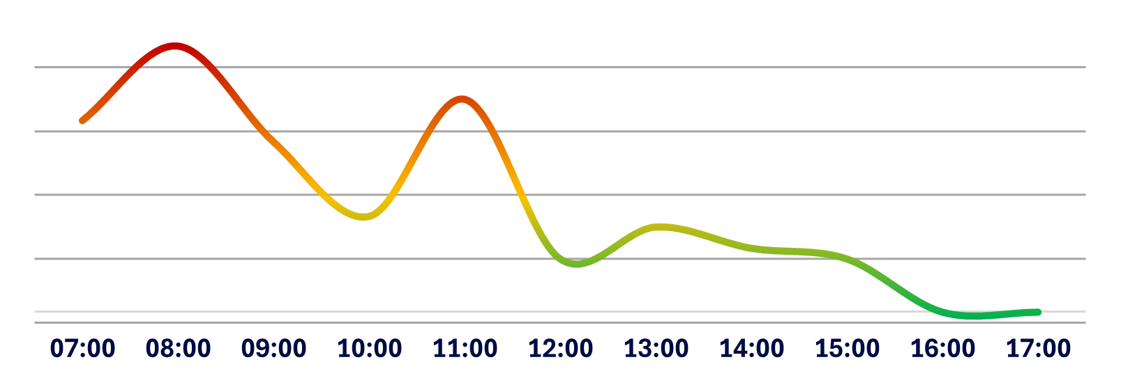 Below is a graphical representation of the average traffic flow from Monday to Friday at Medistri CH. The curve illustrates the busiest and easiest moments to charge or discharge your goods based on historical data.